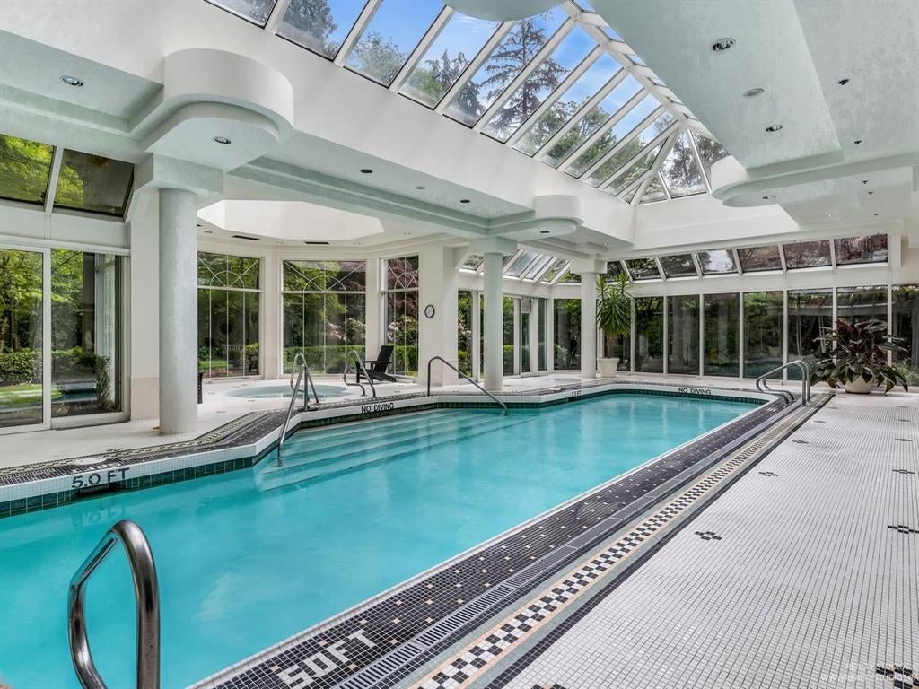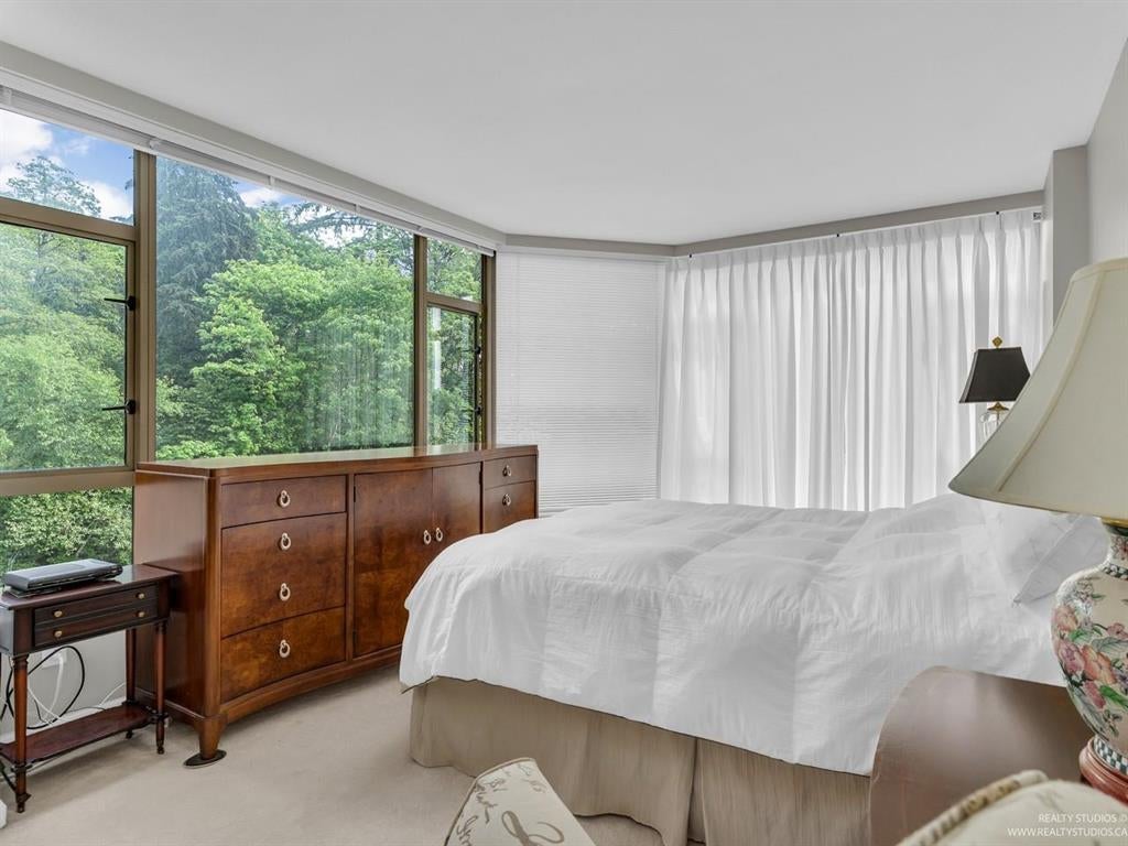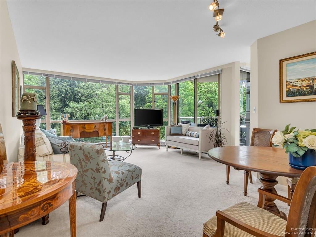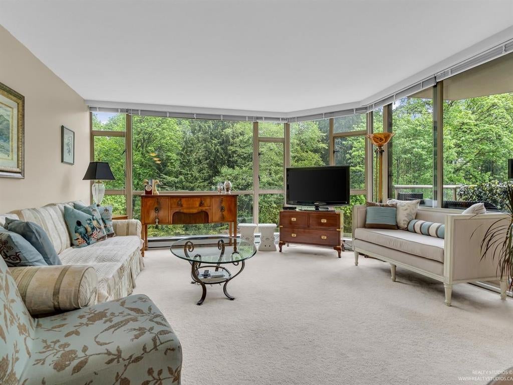 Welcome to one of the Most Desired Buildings on the North Shore. The Carlton at the Club offers resort-style amenities including a grand elegant lobby entrance with a large fireplace, indoor pool, hot tub, sauna, exercise center, library, party room, work shop, theatre, billiards room, card room, guest suite, onsite caretaker, and a private garden. This home boasts 792Sqft living space, floor-to-ceiling windows, in-suite laundry, and a Large walk in closet off the primary Bedroom. The large functional layout offers a beautiful quiet treed exposure, covered balcony, and large living spaces with plenty of storage and built-ins. Just minutes from shopping, groceries, restaurants, and services. 1 parking, 1 storage included. A pleasure to show.